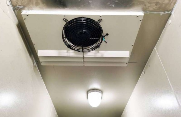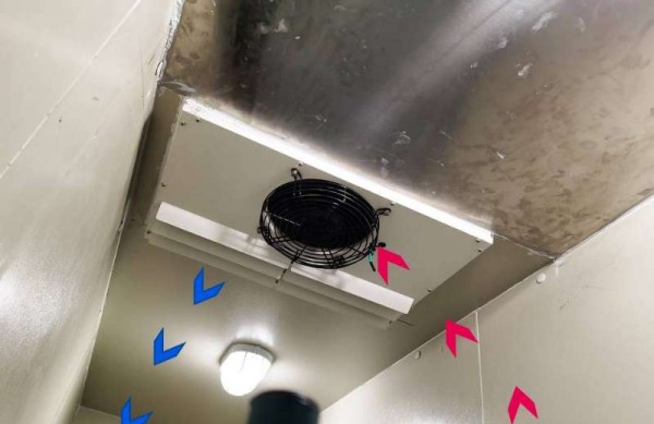 按照蒸發(fā)管裝置的方式又可分直接冷卻和間接冷卻兩種。直接冷卻將蒸發(fā)管安裝在冷藏庫房內(nèi),液態(tài)冷卻劑經(jīng)過低壓蒸發(fā)管時,直接吸收庫房內(nèi)的熱量而降溫。間接冷卻是由鼓風機將庫房內(nèi)的空氣抽吸進空氣冷卻裝置,空氣被盤旋于冷卻裝置內(nèi)的蒸發(fā)管吸熱后,再送入庫內(nèi)而降溫??諝饫鋮s方式的優(yōu)點是冷卻迅速,庫內(nèi)溫度較均勻,同時能將貯藏過程中產(chǎn)生的二氧化碳等有害氣體帶出庫外。