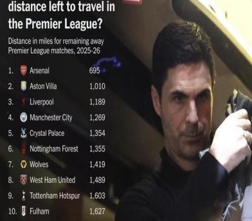 TA列英超各隊剩余客場行程距離:阿森納最少,曼城為其兩倍