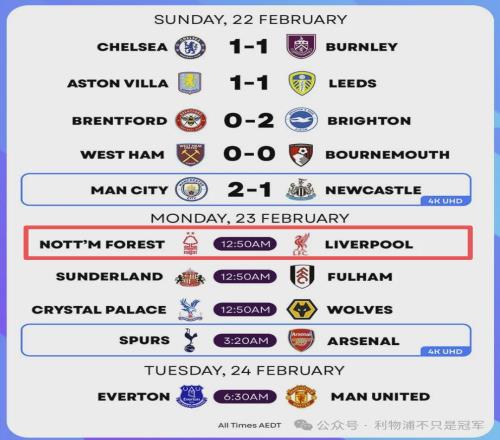 北京時間2月23日,昨晚進行的英超第27輪又結束了4場對決,阿森納4-1熱刺、利物浦1-0諾丁漢森林,富勒姆3-1桑德蘭...