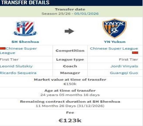 德轉(zhuǎn):賀一然從長(zhǎng)春亞泰加盟成都蓉城的轉(zhuǎn)會(huì)費(fèi)約600萬(wàn)人民幣