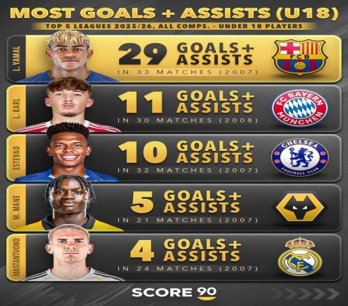 本賽季五大聯賽U18球員直接參與進球榜:亞馬爾第1,卡爾第2