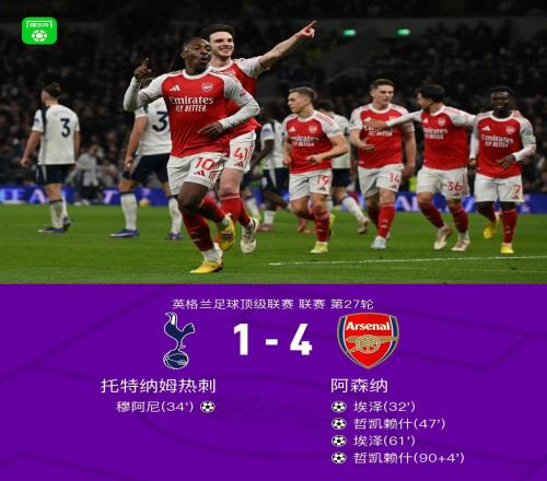 北京時(shí)間2月23日,在英超第27輪的北倫敦德比中,埃澤上下半時(shí)分別進(jìn)球,幫助阿森納在第61分鐘過后客場(chǎng)3-1領(lǐng)先于托...