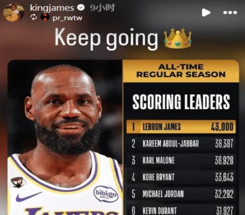 2月23日,湖人球星勒布朗-詹姆斯達成職業(yè)生涯43000分里程碑。賽后他也轉發(fā)了自己得到43000分的海報,并配文:“繼...