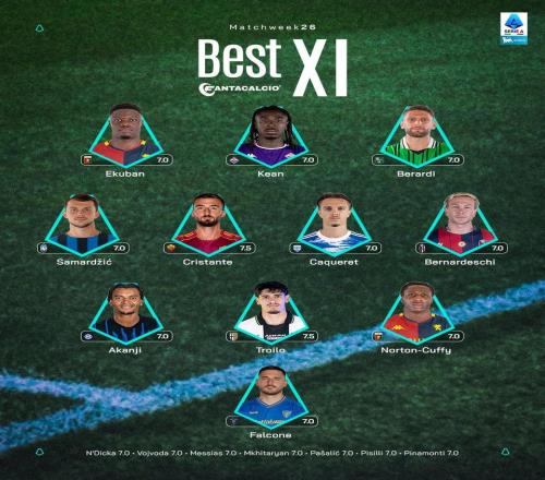 北京時間2月24日,意甲官方評選出了意甲第26輪的最佳11人陣容,莫伊塞-基恩、貝拉爾迪、克里斯坦特、貝爾納代斯...