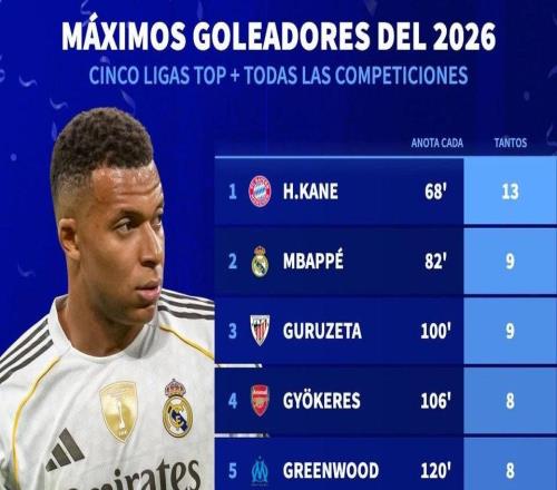 北京時間2月24日,德轉統計出了2026年至今歐洲五大聯賽球員各項賽事的進球榜,哈里-凱恩以13球排名第一,姆巴佩9...
