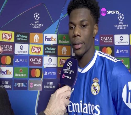 歐冠淘汰賽附加賽首回合,皇馬客場1-0戰(zhàn)勝本菲卡,皇馬中場楚阿梅尼賽后接受了TNT體育墨西哥頻道的采訪。感謝你...