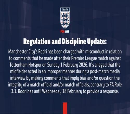 英足總指控羅德里在與熱刺比賽后的發言不當,需在2月18日前做出回應_英超直播