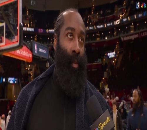 2月25日宣 在NBA常規賽中,騎士以109-94大勝尼克斯,成功拿下本賽季對陣尼克斯的首場勝利。賽后,哈登在場邊接受...