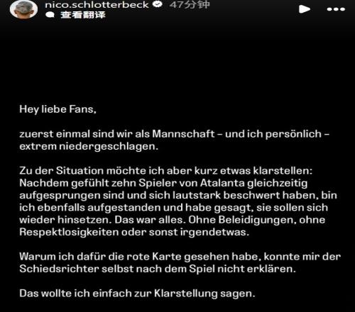施洛特貝克對紅牌提出質疑表示我只是想讓亞特蘭大安靜主裁賽后同樣無言以對_德甲直播