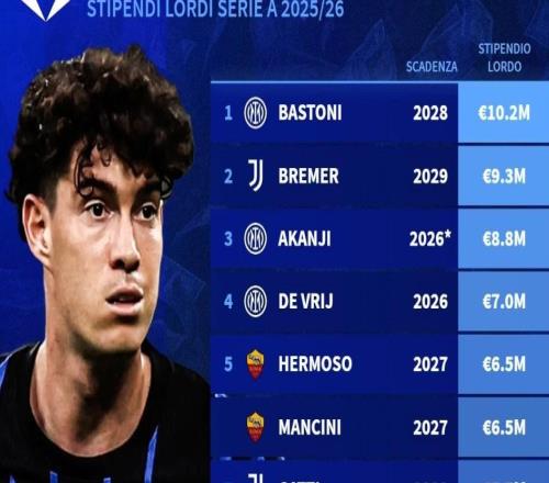 本賽季意甲中衛年薪榜:巴斯托尼1020萬歐第1,布雷默930萬第2