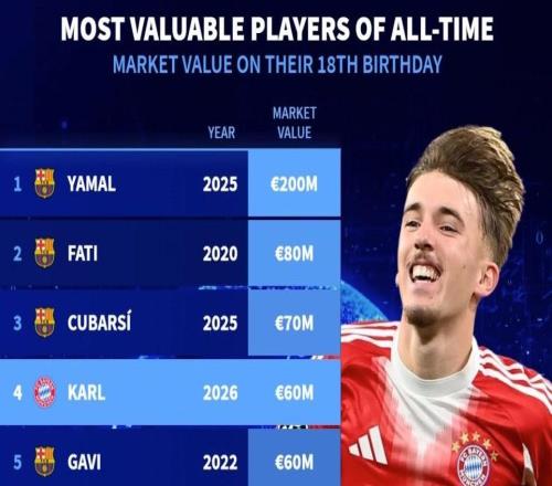 德轉歷史18歲球員生日當天身價榜:倫納特卡爾6000萬歐元第4