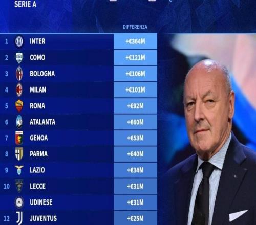 意甲球隊陣容成本和現有價值差價榜:國米第一,那不勒斯墊底