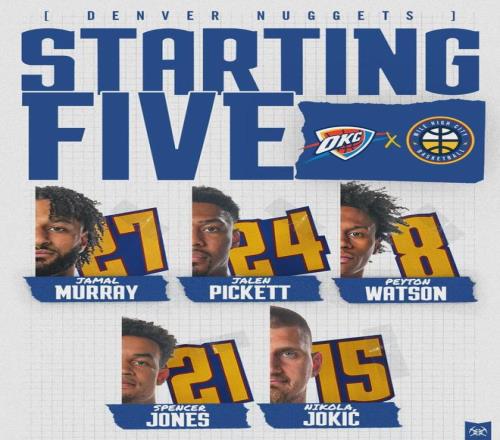掘金戈登、布勞恩和卡梅倫-約翰遜繼續休戰,雷霆杰倫-威廉姆斯和卡魯索也不能打,兩隊都不是完整陣容。掘金首發:穆雷、皮克特、斯潘塞-瓊斯、沃特森、約基奇。雷霆首發:亞歷山大、卡森-華萊士、多爾特、霍姆格倫、哈滕。