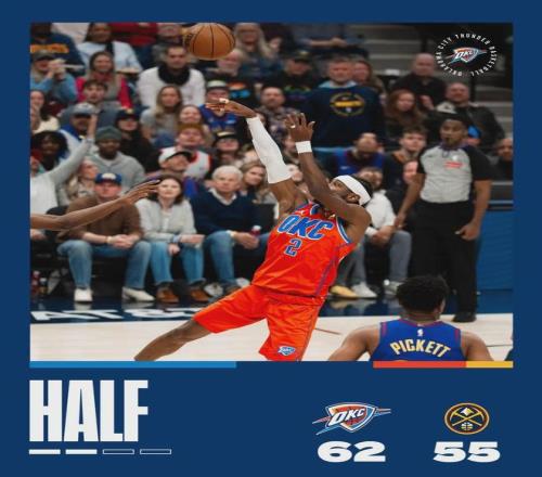 亞歷山大不斷點名小哈達威,單節9分進賬,掘金替補斯特勞瑟站出來跟亞歷山大對飆。第二節雙方陷入拉鋸戰,雷霆單節30-29贏了掘金1分。上半場打完,雷霆62-55領先掘金。約基奇打了15分鐘,2投2中僅得到6分1板6助4失誤。