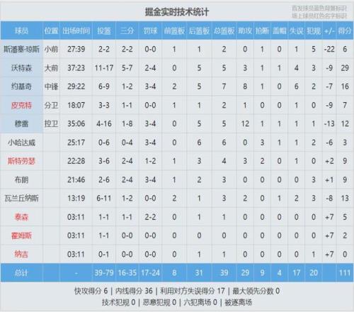 卡森-華萊士三分11中7砍下27分6板2斷,得分和三分命中數都是生涯最高。掘金全場比賽從未領先過,此役過后跌至西部第三。最后看看數據: