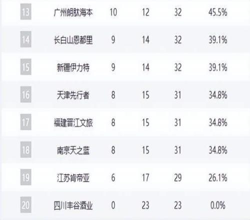 底部陣營慘烈廝殺:天津、福建、同曦三隊同為8勝15負,江蘇(7勝16負)與四川(6勝17負)則深陷泥潭,保級壓力山大。