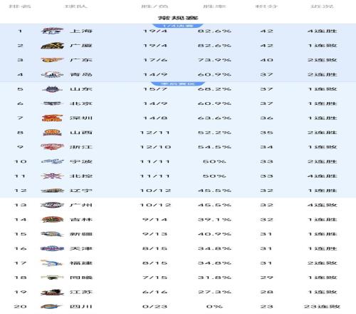 常規賽第一階段結束之后的最新積分榜排名: