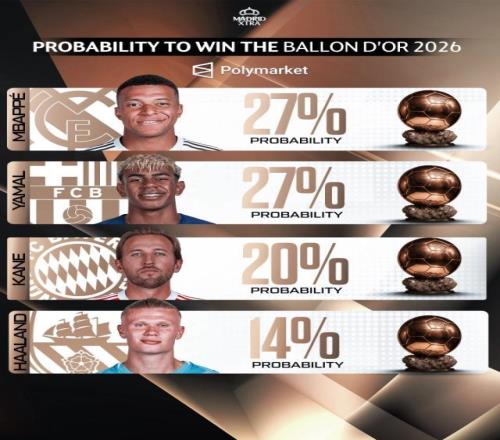02月04報道 相關機構近期更新了2026年金球獎的獲獎概率預測,目前姆巴佩與亞馬爾并列領跑,兩人獲獎概率均為27%,凱恩和哈蘭德則緊隨其后。