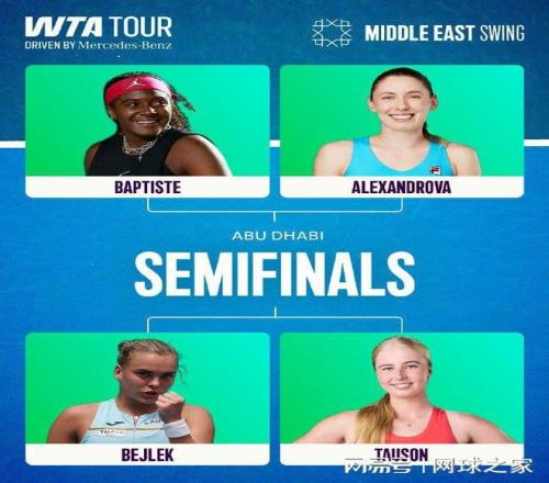 女子賽場:在WTA500阿布扎比站單打1/4決賽中,2號種子、俄羅斯名將亞歷山德洛娃以6-3 6-3擊敗菲律賓一姐伊埃拉,挺進半決賽將戰持外卡出戰的美國人巴普蒂斯特,后者以6-2 4-6 6-4爆冷淘汰5號種子、俄羅斯人薩姆索諾娃,本周連勝兩位TOP20球員,打進職業生涯首個巡回賽四強。另外兩場較量,資格賽球員貝萊克和丹麥新星陶森分別戰勝各自對手,會師半決賽。