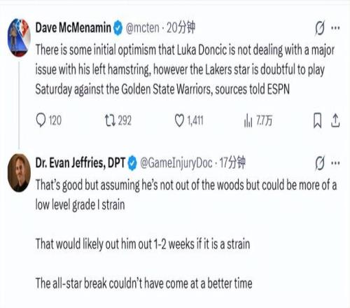 當然,這也意味著東契奇可能缺席全明星,世界隊將又損一員大將。此前,字母哥、亞歷山大都已經(jīng)因傷無緣參加全明星。