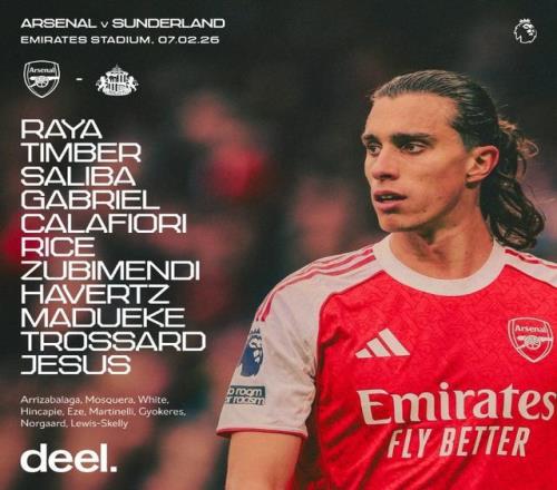 阿森納首發(fā):1-拉亞、12-廷貝爾、2-薩利巴、6-加布里埃爾、33-卡拉菲奧里、41-賴斯、36-蘇比門迪、29-哈弗茨、20-馬杜埃凱、19-特羅薩德、9-熱蘇斯
