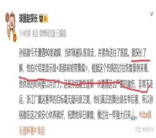 當(dāng)然,真正糟糕的是,在比賽開場不久后,廣廈的核心后衛(wèi)孫銘徽便意外受傷。根據(jù)現(xiàn)場畫面來看,孫銘徽是在一次突破中,誤踩了迪亞洛的腳,意外崴腳。在談到這一次崴腳時,孫銘徽毫不避諱的表示,這是他職業(yè)崴腳最嚴(yán)重的一次。隨后,他被隊(duì)友背著離開賽場。賽后,根據(jù)知情人士透露,孫銘徽這一次傷到了距腓前韌帶撕裂,將會缺席接下來的比賽。而對于孫銘徽會缺席多久,根據(jù)該知情人士透露,孫銘徽此次傷停,恐怕會以月計(jì)。