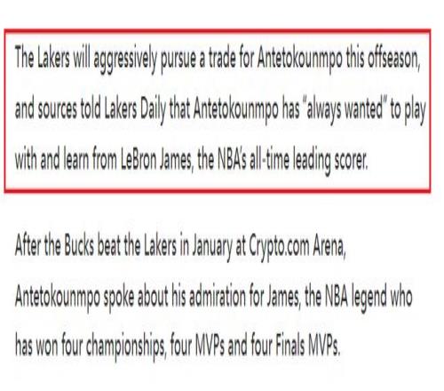 北京時間2月10日,根據美媒LakersDaily的報道,湖人將在休賽期積極尋求交易得到揚尼斯·阿德托昆博。消息人士告知,阿德托昆博一直渴望與NBA歷史得分王勒布朗·詹姆斯并肩作戰并向他學習。