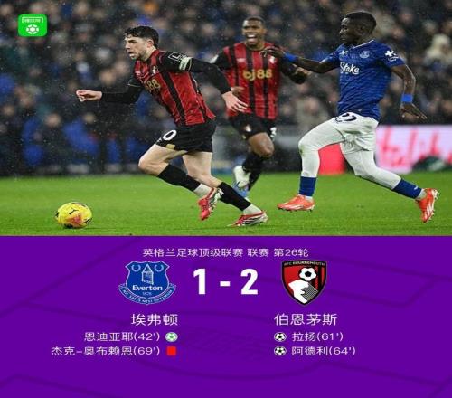 北京時間2月11日英格蘭足球頂級聯賽 聯賽 第26輪,埃弗頓主場對陣伯恩茅斯。埃弗頓恩迪亞耶破門。上半場,恩迪亞耶主罰點球命中打破場上平衡。下半場,拉揚接特呂費爾的傳球將比分扳平。隨后,希爾助攻阿德利破門將比分反超。第69分鐘,奧布賴恩放倒阿德利破壞單刀機會被直紅罰下。最終,伯恩茅斯2-1逆轉埃弗頓,客場全取三分。