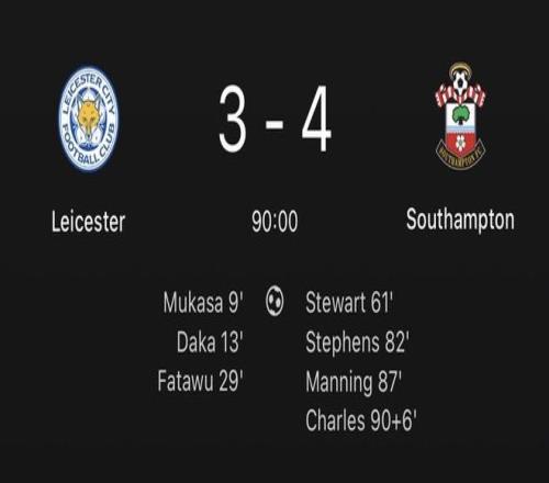 然而眼看勝局在握,萊斯特城卻在下半場離譜崩盤。斯圖爾特、斯蒂芬斯和曼寧在第61分鐘至第87分鐘這短短的26分鐘內(nèi)連進3球,幫助做客的南安普頓扳平比分。