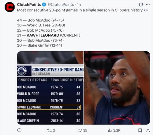 此役還沒開打,轉(zhuǎn)播方給了一項(xiàng)數(shù)據(jù),倫納德已經(jīng)連續(xù)31場20+快船隊(duì)史第三,他還差一場就追平75-76賽季的麥卡杜連續(xù)32場20+,但首節(jié)他被阿門、伊森纏的挺厲害只拿到4分1助攻。