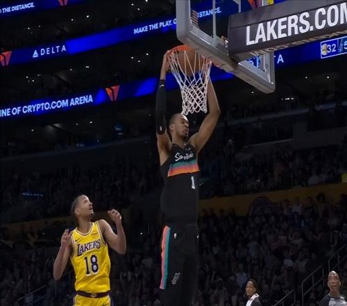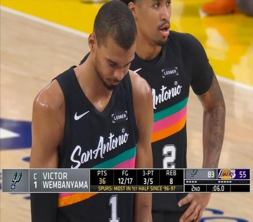 這場球一開場,文班亞馬就給比賽奠定了基調,他里突外投,造犯規,補籃,扣籃,什么都有,湖人根本沒法防守。首節打了8分鐘,8投7中,狂砍25分,太恐怖了。單節25分,是他個人單節紀錄。第二節比賽,文班亞馬中段才登場,但他登場后,并沒有首節那種攻擊欲望,但是他強大的強制力,以及全方位的火力覆蓋,還是讓湖人防不勝防,第二節文班亞馬砍下12分,上半場就砍下37分!