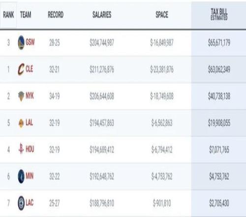 勇士6567萬力壓騎士6306萬繼續霸占榜首,尼克斯4074萬奢侈稅,湖人、火箭、森林狼、快船的奢侈稅則分別是:1991萬、707萬、475萬和271萬。