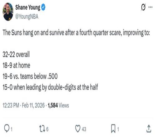 拿下勝利后太陽隊戰績提升至32勝22負,繼續占據西部第七的同時,將落后身前西部第5湖人與第6名森林狼之間的差距縮小到0.5個勝場,再度向西部前六發起沖擊。