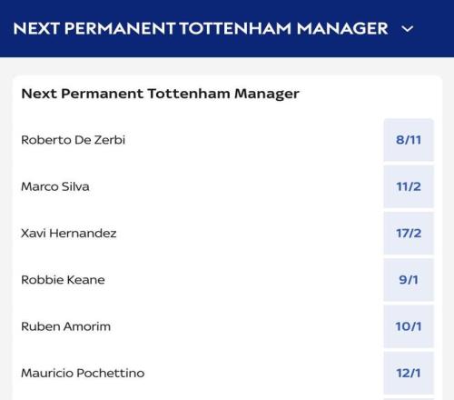 熱刺新帥賠率:德澤爾比居首,哈維、阿莫林、波切蒂諾上榜 懂球帝 2026-02-11 22:06:08 北京時間2月11日,在托特納姆熱刺解雇原主帥托馬斯-弗蘭克之后,Squawka的統計指出,前馬賽主帥德澤爾比是目前賠率最高的接替者。Squawka熱刺新帥賠率:德澤爾比 8/11馬爾科-席爾瓦 11/2哈維 17/2羅比-基恩 9/1阿莫林 10/1波切蒂諾 12/1【上咪咕獨家看英超】英超免費觀看_哈維免費觀看_阿莫林免費觀看_英超高清在線_哈維高清在線_阿莫林高清在線 英超 哈維 阿莫林 熱刺隊 席爾瓦 德澤爾比 毛里西奧·波切蒂諾 上一篇: 英超熱刺官宣主帥弗蘭克下課,新帥首秀即遇阿森納 下一篇: 馬特勞:弗蘭克總在球員面前念叨阿森納,熱刺球員真聽煩了