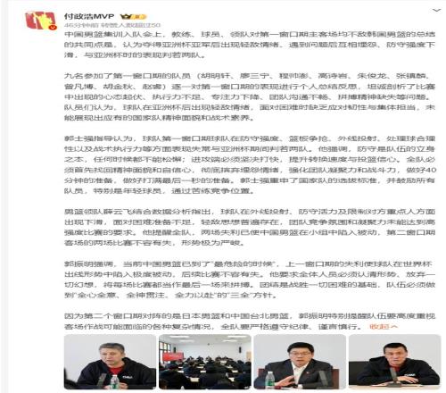 中國男籃的集訓(xùn)入隊(duì)會上,郭振明表示‘中男籃已經(jīng)到了最危險(xiǎn)的時候’,上一個窗口期的二連敗讓球隊(duì)在世界杯出線形勢極度被動,后續(xù)的比賽不容有失,需要全體人員認(rèn)清形勢放棄一些幻想,把每一場比賽當(dāng)最后一場去拼。