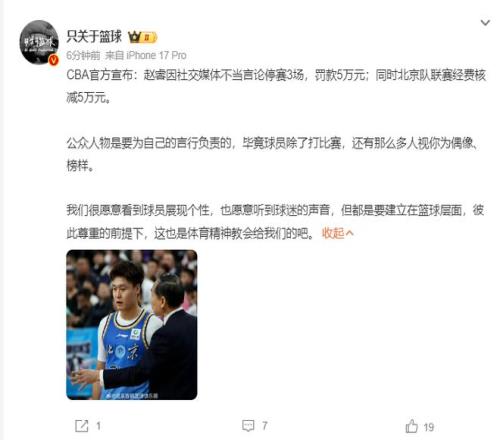 直到2月2日趙睿才在個人的社交媒體上發(fā)布了道歉聲明,但趙睿的道歉并沒有獲得球迷們的諒解,因?yàn)橼w睿太多的過往黑歷史:穿美國男籃訓(xùn)練服、上海佬不想打XXX等等。這份處罰通知出爐后,趙睿將錯過3月11日vs四川、3月14日vs廣州(客)、3月16日vs天津的3場比賽。