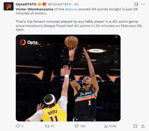 18.文班亞馬不到30分鐘拿到40+歷史第三;