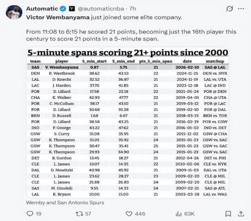 5.文班亞馬22歲38天首節(jié)25分PBP時代最年輕;