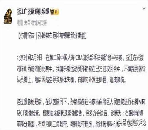 北京時(shí)間2月11日,根據(jù)廣廈男籃官方社媒公示,孫銘徽右距腓前韌帶部分撕裂,預(yù)計(jì)將會(huì)傷停6-8周。