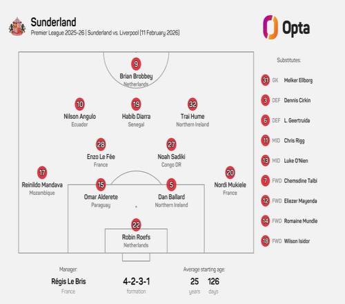 桑德蘭首發:22-羅埃夫斯、20-穆杰萊、5-巴拉德、15-阿爾德雷特、17-雷尼爾多、32-休姆、27-薩迪基、28-勒費埃、10-尼爾松-安古洛、19-哈比卜-迪亞拉、9-布羅貝伊