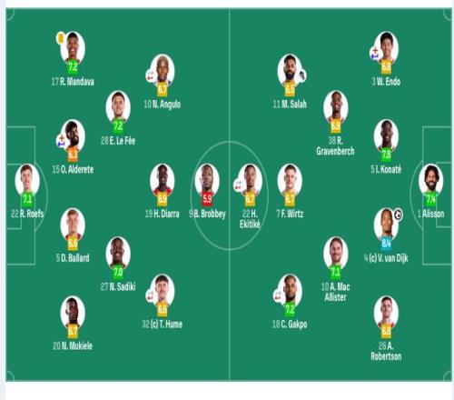 利物浦首發:1-阿利松、26-羅伯遜、4-范戴克、5-科納特、38-赫拉芬貝赫、3-遠藤航(69’2-戈麥斯)、10-麥卡利斯特、7-維爾茨、11-薩拉赫、18-加克波(75’17-瓊斯)、22-埃基蒂克(88’14-基耶薩)。