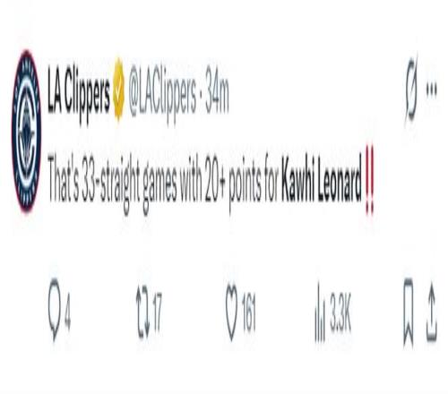 此役后小卡還連續(xù)33場比賽拿到20+快船隊(duì)史獨(dú)享歷史第三。
