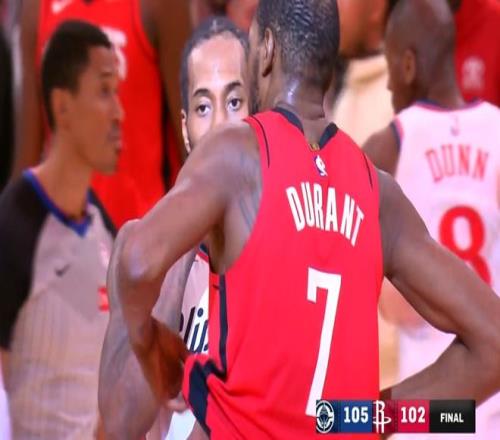 當(dāng)時(shí),火箭還剩下最后兩秒,杜蘭特被完全防死,他雖然擺脫了萊昂納德的防守,但是小瓊斯補(bǔ)防到位沒讓他接到球。隨后,申京錯(cuò)失絕平三分。