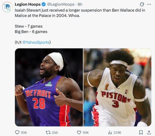 但也有人為斯圖爾特發聲,美媒Legion Hoops就感嘆斯圖爾特比當年奧本山宮殿事件中的本-華萊士被禁賽的場次還多。