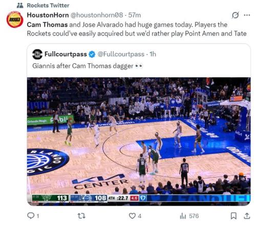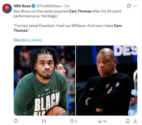 休媒賽后轉發了托馬斯超遠三分的瞬間寫道:原本我們有機會簽下托馬斯這樣的得分手,但烏度卡更愿意使用阿門、泰特這樣的防守者都不愿意簽得分手。