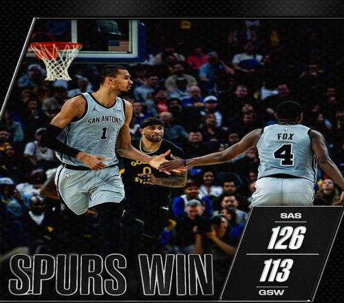 文班亞馬助攻??怂固兜梅?,格林回敬遠投。格林搶斷福克斯,隨后助攻波杰姆斯基籃下得手。分差僅為7分,勇士看到贏球希望。凱爾登約翰遜強攻禁區得手,格林失誤,文班亞馬2罰全中。格林再次失誤,福克斯暴扣。桑德斯遠投不進,比賽時間走完。最終,馬刺以126比113力擒勇士,得以上演16分逆轉好戲。圣安東尼奧豪取6連勝,鞏固了西部第2的排位。勇士末節以19比32落后,慘遭翻盤。