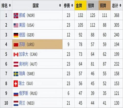 (冬奧會歷史獎牌榜,圖:Wiki)▼