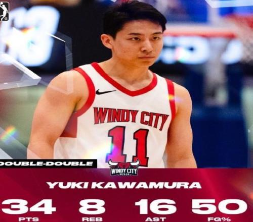 2月12日,NBA發展聯盟比賽中,河村勇輝狂砍34分8籃板16助攻,他也是聯賽歷史唯一取得類似數據的球員。