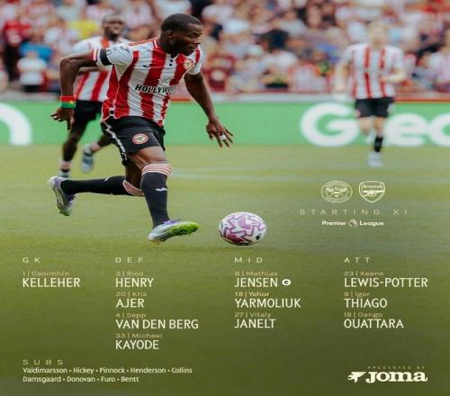 布倫特福德首發:1-凱萊赫、33-卡約德、20-阿耶、4-范登貝爾赫、3-亨利、27-雅內爾特、18-亞爾莫柳克、8-延森、23-波特、9-蒂亞戈、19-瓦塔拉