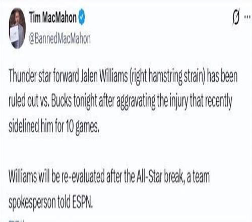 北京時間2月13日,據雷霆隊發言人向ESPN透露,球隊明星前鋒杰倫-威廉姆斯不到四周內第二次右腿筋拉傷,將在全明星賽后接受復查。
